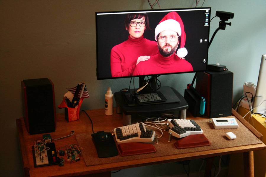 Right now I'm running a 2015 13" MacBook Pro, though I'm hoping to upgrade sometime this year. My monitor is a 27" Dell U2718Q, basically just a 4k monitor. I use a Logitech webcam and Apple AirPods for video conferences, and I use a CST Laser Trackball, and an ErgoDox EZ for inputting stuff in to my computer. I also use a GQ GMC-320 for detecting nuclear radiation. I like it because it logs data and I can get the data off it via UART over USB. I own 3 geiger counters, and this one is my favorite (I bought them because I lost some uranium ore in my apartment and wanted to find it).