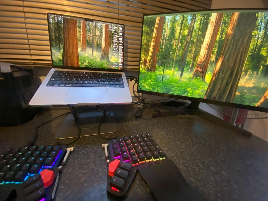 I own a very minimal yet effective hardware setup. For a long time, I was using a mid-2014 Apple MacBook Pro 6th gen Intel (a testament to Apple's great hardware and software optimization), and recently switched to a 2021 M1 Pro MacBook Pro and have been happy with how well it performs whilst staying cool and silent (I've yet to hear its fan spin). Pair that with a single 27" 1080p Samsung LS27C... display, and not forgetting the ZSA Moonlander, my very first split mechanical ergonomic keyboard (more on that later). I also got myself a Rayswitch 360 laptop stand that raises my laptop to eye level when working on the desk, reducing the strain on my neck.