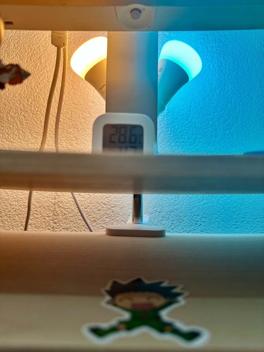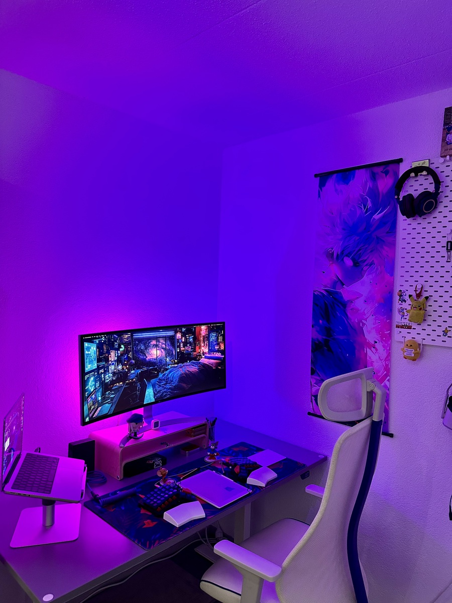 At home, my setup includes an LG 34UC99-W Ultrawide monitor (six years old and still going strong) on an IKEA VATTENKAR monitor stand, a Magic Trackpad, and my Moonlander. Two Philips Hue bulbs behind the monitor (I named them Fire 🔥 and Ice 🩵), attached with an E27 clip + splitter, light the space. It all sits on an IKEA RODULF electric standing desk.