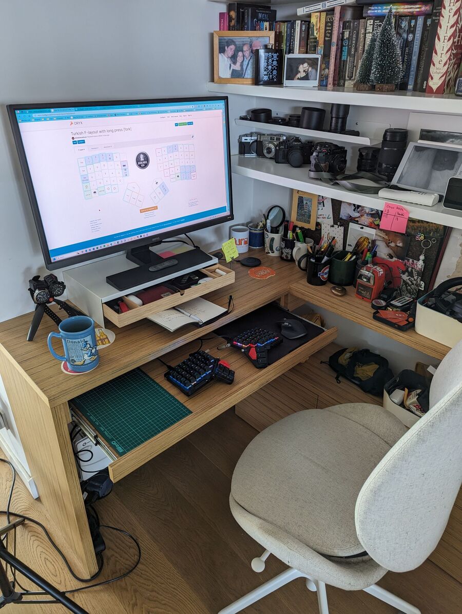 I currently use a five-year-old CUK Hades Canyon NUC Premium VR Mini Desktop Gaming PC. I initially bought it for gaming and photography postproduction, but later delegated it as my at-home workstation during the COVID lockdown. The small dimensions are a real lifesaver, and the hardware still holds up for work-related stuff, despite the belated addition of a BENQ 4K monitor. I also use the Logitech MX Master 3S mouse and the Moonlander MK 1 as my primary input devices. They are both nested under a sliding desk.