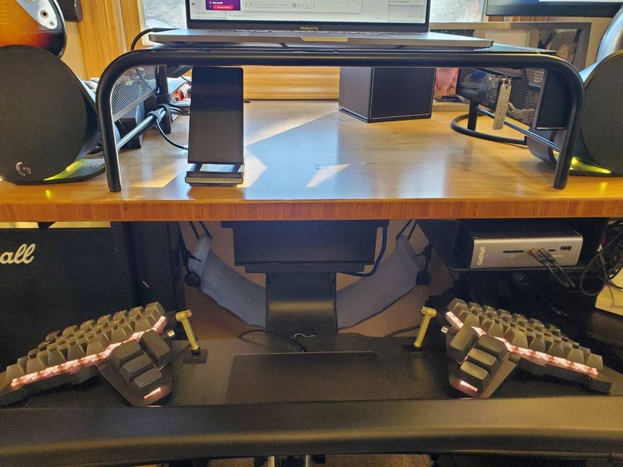 My desk is an UPLIFT Desk with a 48"x24" bamboo top. I sit in an UPLIFT Pursuit chair, and when I'm standing, I'm usually on my UPLIFT Motion-X balance board. For more variety, I also sometimes use my UPLIFT foot hammock or my DeskCycle under-desk exercise bike. I have enhanced my desk with LED strips to make my workspace glow, which really makes hanging out a joy at both day and night. I'm obsessed with cable routing, and have gone to great lengths to make the immense amount of wiring on and around my desk as inconspicuous as possible.