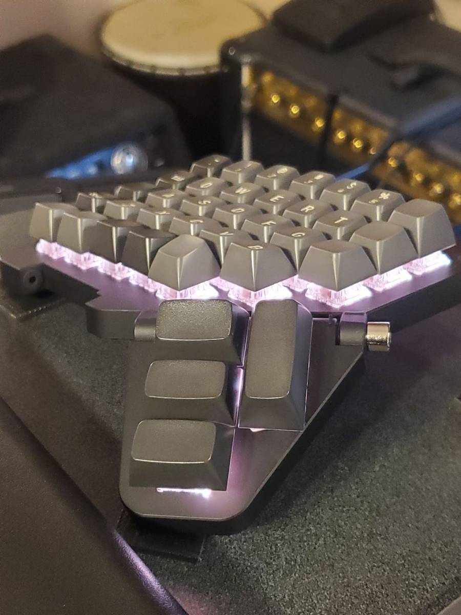 As far as my hardware, I have Drop + Matt3o MT3 Susuwatari keycaps, which I love because they are sculptured and have spherical tops. Combined with the tent and split, it really makes the whole setup fit my body perfectly. I also added Zilent V2 silent tactile switches, because I spend a lot of time on calls, and I don't want my note-taking to be distracting.