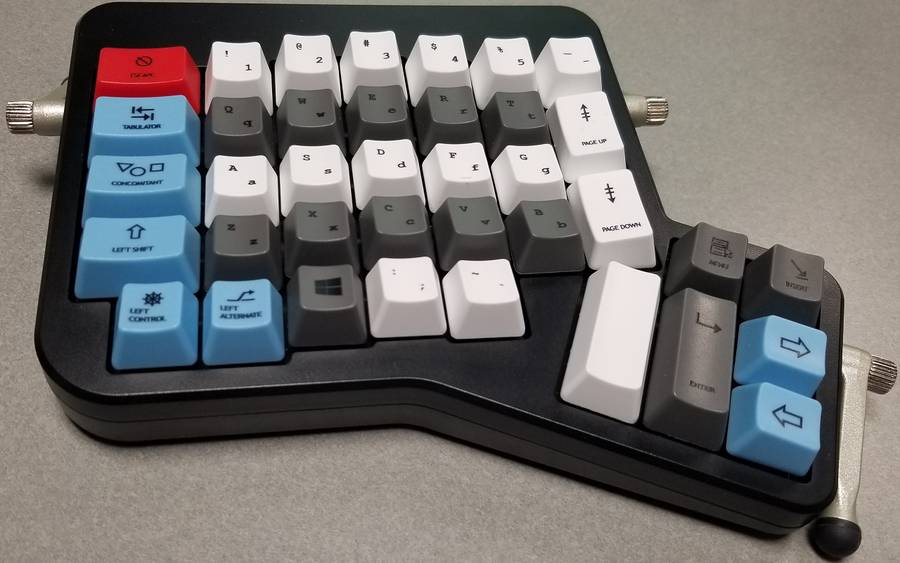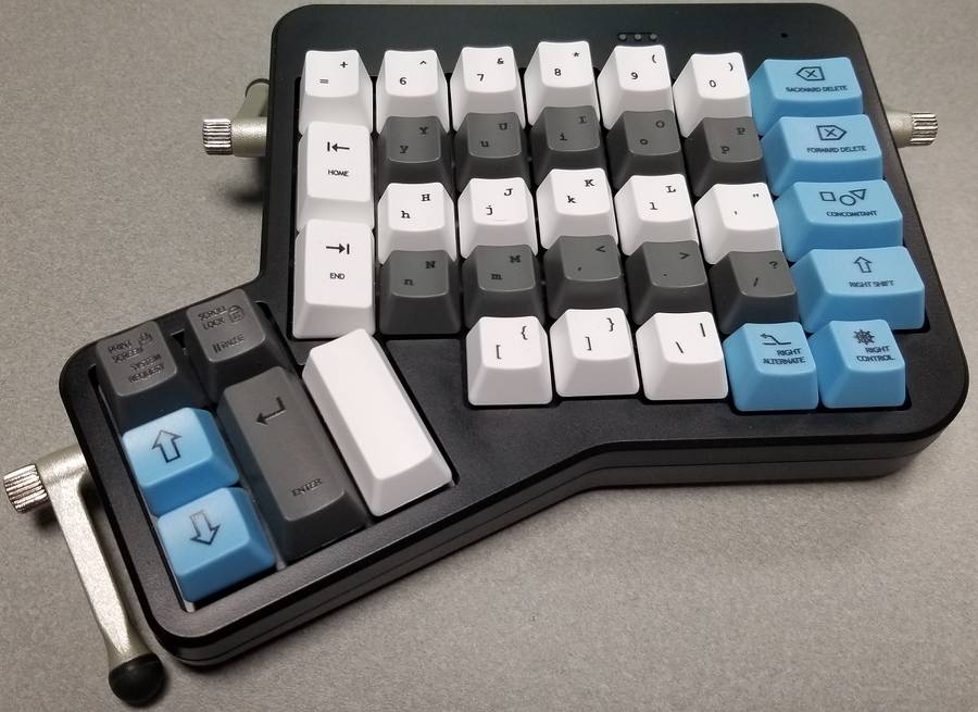 Rounding out Layer 1 are my function keys, number pad, and mouse controls 'just in case'. For keycaps, I created my own custom keycap set so that every key on 'Layer 0' would be appropriately labeled. I had the keycaps printed by MAXkeyboard and the turn-around time and quality were great. It was a lot of fun to think about the symbols to use for modifiers, letter choice and layout, and the color scheme.