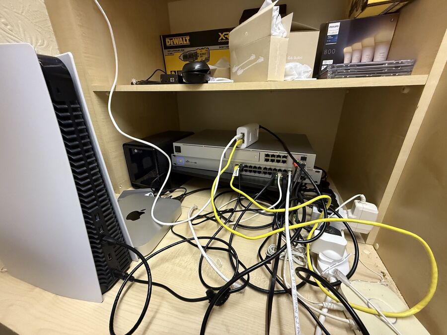 Beyond my office I have started building up my homelab with some UniFi equipment driving my network, a Mac mini hosting some Docker containers and a Beelink Mini PC running Proxmox that I haven’t started playing with, all hiding inside my secret bedroom cupboard! In fact, I just managed to run my first cable through the loft today before submitting this interview!