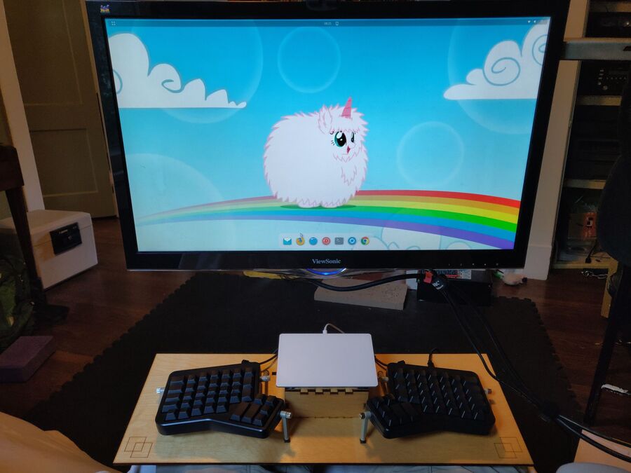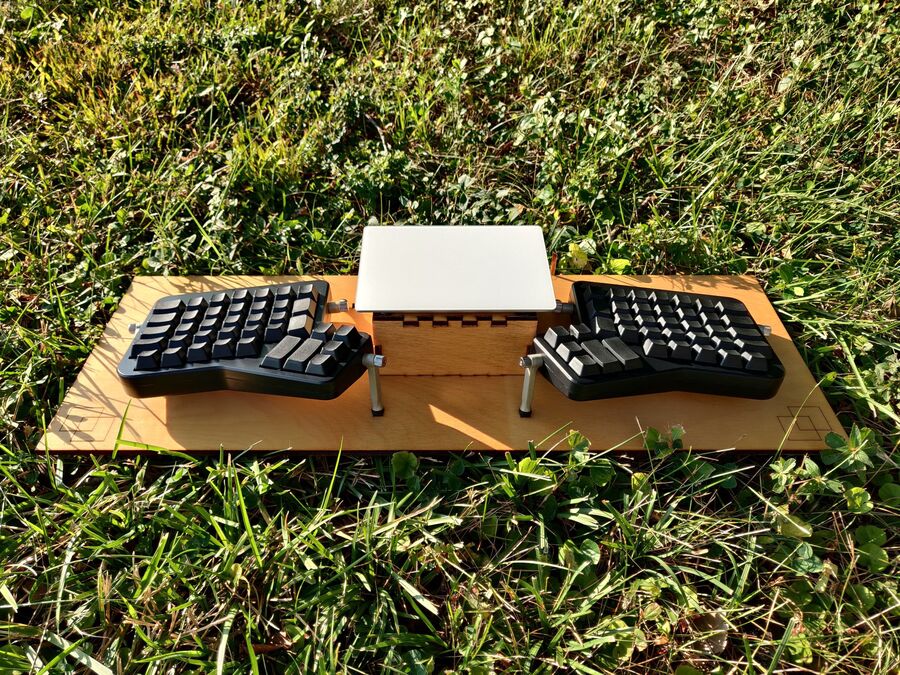 I have the keyboard sitting on a simple custom tray that I laser-cut. The tray has registration marks for the keyboard legs so they don't move around. There is also a platform in the middle for a Magic Trackpad 2, which I previously had attached to the Advantage2. The tray sits on my lap as I work, close to my knees so my arms are stretched out. My chair is a zero-gravity style, slightly reclined, and my monitor is on an adjustable arm that I can position as needed.