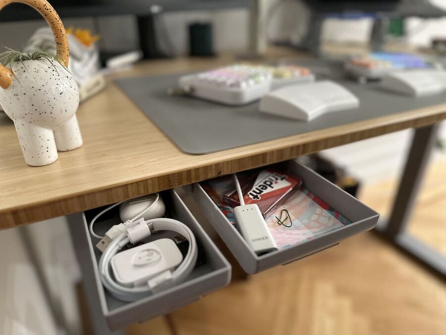 I stuck two Yoousoo Drawer organizers under my desk for the clutter I don’t need every day. The drawers typically have paper clips to flash my firmware, backup earphones, a notepad, and a pack of gum for when I am in crunch mode. I sit in a Steelcase Series Air 2 chair with a 3D Microknit back, four-way adjustable arms, wheels for hard floors, a mesh headrest, and additional lumbar support. If I’m taking video calls when other folks are around, I use my AirPods Pro (second generation).
