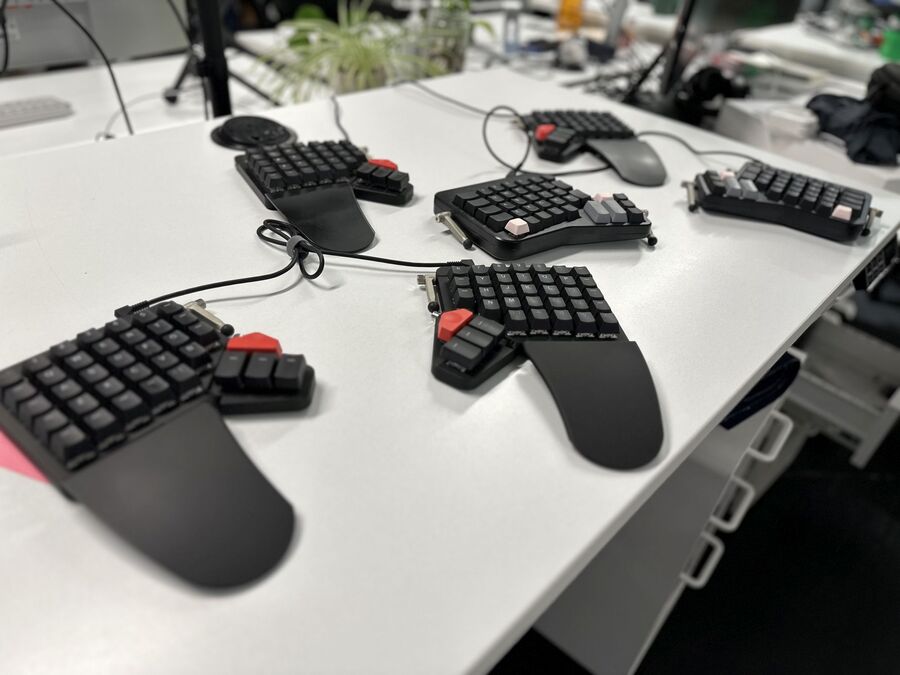 I have Cherry MX Browns switches on my home keyboard, but I have Cherry MX Reds on my work keyboard. I went for the reds for the slight difference in volume—after being remote for 2+ years I was self-conscious of how noisy my typing would be in an office. I was even self-conscious of what people would think of me for bringing in an ErgoDox in general…like wow she is extra. But I was relieved when another coworker whipped out their Moonlander. We actually inspired someone from the marketing team to get a Moonlander!