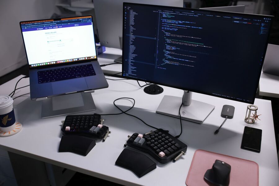 I have a 2021 16” MacBook Pro with a 27” LG 27BN88U-B Ergo IPS UHD 4K Ultrafine™ Monitor and Logitech MX Master 3 Wireless Mouse. I use a Hiearcool USB C Multi-port Adapter to connect my ErgoDox to my laptop, which is perched on a laptop stand. My keyboard and mouse are on an Aothia Leather Desk Pad Protector, and my desk is a 53 x 29 bamboo Autonomous SmartDesk Pro. I connect all of my desk hardware (including my desk) to a Tripp Lite TLP1208TELTV 12 Outlet Surge Protector Power Strip.