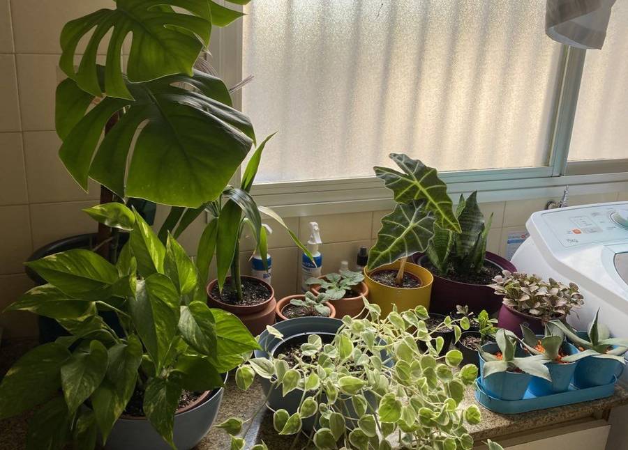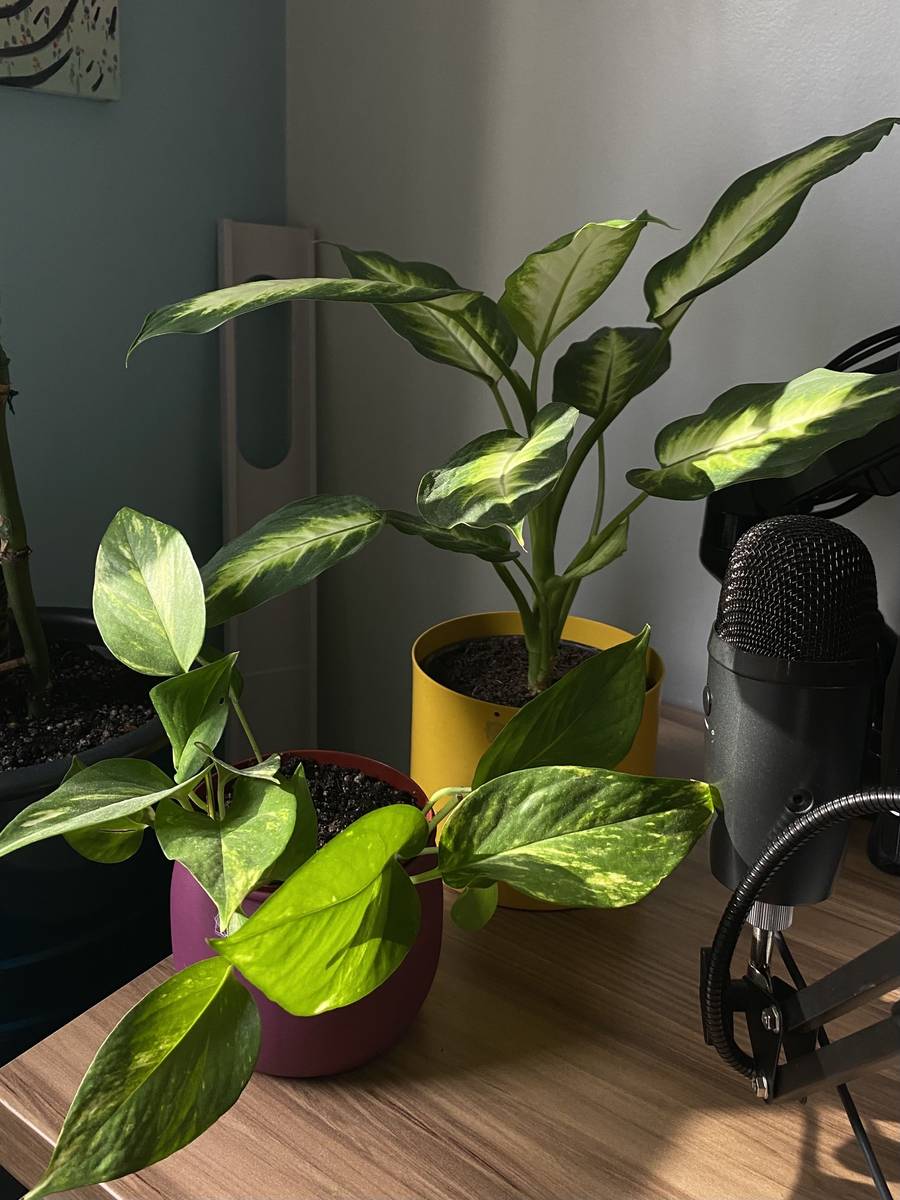 I also have a few plants in my office: a Monstera deliciosa right by my window; an Epipremnum aureum and a Dieffenbachia Camilla on the left side of my desk and two Dracaena trifasciata on the right side; a Fittonia albivenis and a Epipremnum aureum cutting on the shelves of the pegboard; and yet another Epipremnum aureum and a Peperomia scandens on the upper shelf.