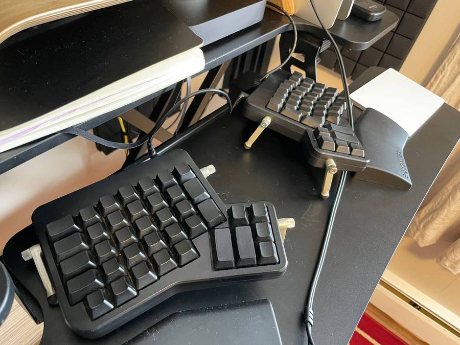 I use Cherry MX Blue switches because that’s what the ErgoDox EZ configurator recommended. So far, so great! The tenting kit and wings are a must. My keycaps are blank because I wanted each row to have its own sculpted slant more than I wanted other people to be able to use the keyboard. My spouse...well, she uses her own computer.