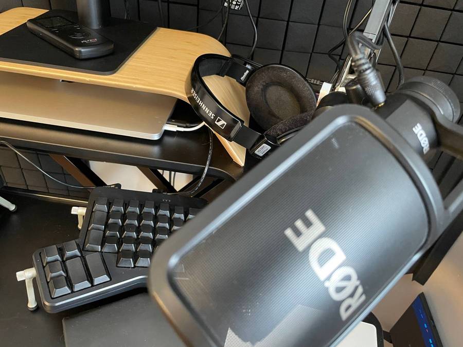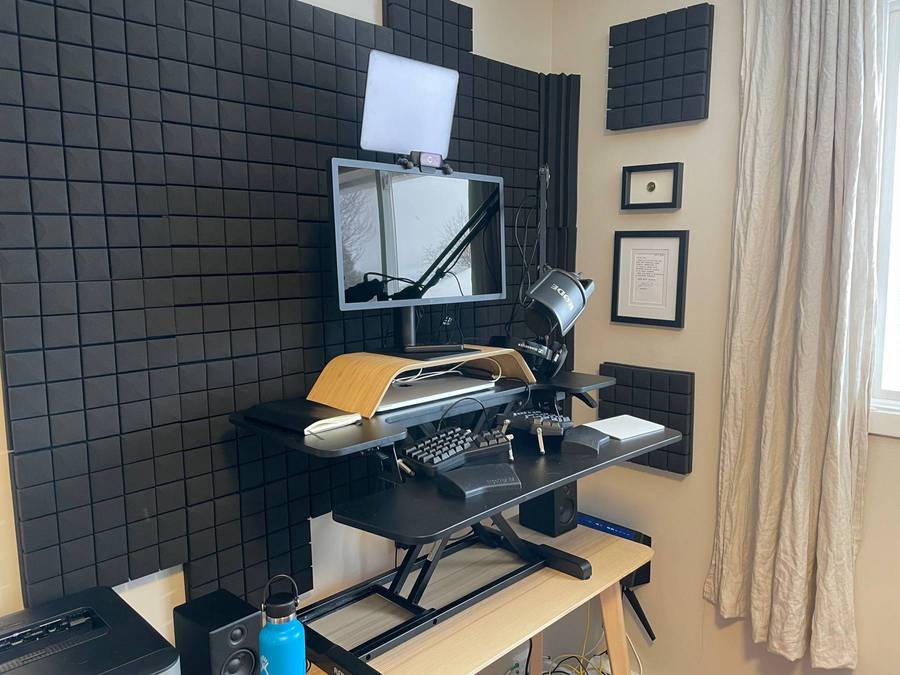 As a hobby photographer, I really value a nice monitor. I currently use a 22” LG UltraFine display, for the sake of Apple compatibility. I’d like a bigger one someday. Communicating effectively is a huge part of my job, so I use a dedicated webcam and a fill light, with a RØDE NT-USB mic on a boom stand. A friend gave me a pair of Sennheiser HD 58X open-back headphones, which I fell in love with. Acoustic foam covers the wall around my computer, to reduce echo and to make me feel like a badass. My Herman Miller Aeron chair is aging quickly (I bought it used on Craigslist) but replacement parts have been easy to find on eBay. I use an Apple Magic Trackpad and, of course, an ErgoDox EZ keyboard!