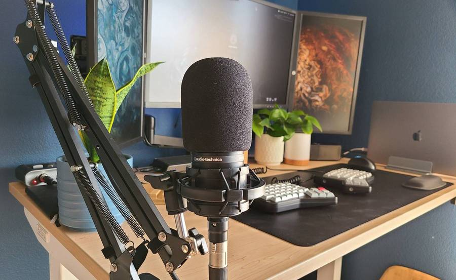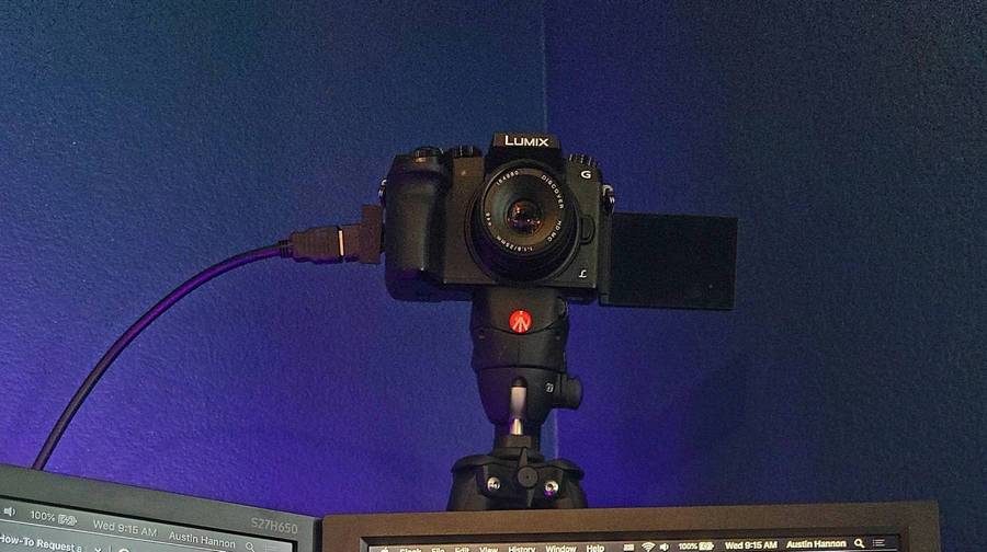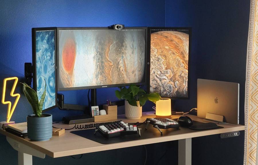 I use a work-provided 2020 16" MacBook Pro, with my home office setup being a Samsung SH650 27" monitor flanked by two vertically mounted HP P204 19.5" monitors (using Slack and Visual Studio vertically will change your life). The monitors are held up by a MountUp adjustable desk mount attached to my Uplift V2 desk, alongside a boom arm-mounted Audio-Technica 2020 microphone and a Lumix G7 mirrorless camera acting as my webcam. All of this feeds into a single Targus dock that connects to my MacBook, which sits in an Omoton aluminum stand. The camera and microphone are a bit overkill for your everyday meeting, but it's a great icebreaker when I'm meeting with someone for the first time in this new work-from-home world.