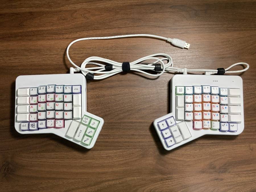 Other miscellaneous changes/notables: I gave Find and Find-and-Replace their own key (tap for Ctrl+F, tap-hold for Ctrl+H). I foresee moving those functions to their respective letter keys (like those explained just above) if/when I decide I want something else in that spot. Ctrl, the Windows key, and Alt are all in the bottom left. I don't use Esc often, so I moved it to the second layer. Insert and the calculator key are at the inner upper corners of each half. My bracket symbol keys are set up with tap dance to zoom in and out upon tap-hold. My Tab key is in the right thumb cluster, which is extra convenient for when I work in spreadsheets, as it's near the number pad (for that layer, I also replaced the space bar in the neighboring thumb cluster with another Enter). I also have Tab set up as a tap dance key so that a tap-hold will bring up all my virtual desktops. My left and right arrow keys are set up in a similar manner such that a tap-hold will go to the next desktop in the corresponding direction. I have a Ctrl+Shift combination modifier, which is primarily for switching between input languages.