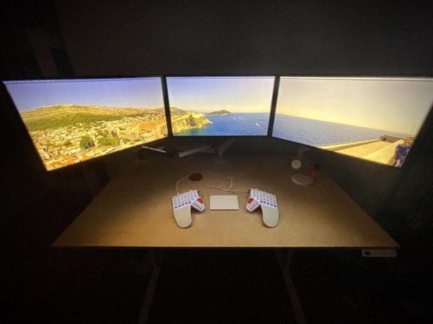 My primary workstation is an M1 Mac Studio with 32 GB RAM and a 1 TB SSD, which I have hidden in a box out of sight beneath my desk. Connected to it are three 27” Apple Studio Displays that float above my desk with LCD Arms.