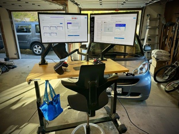 Since I live in California where it’s sunny most of the year and the weather is 20-25C/60-80F, I built a hiking rig so I can get exercise and fresh air when I code.