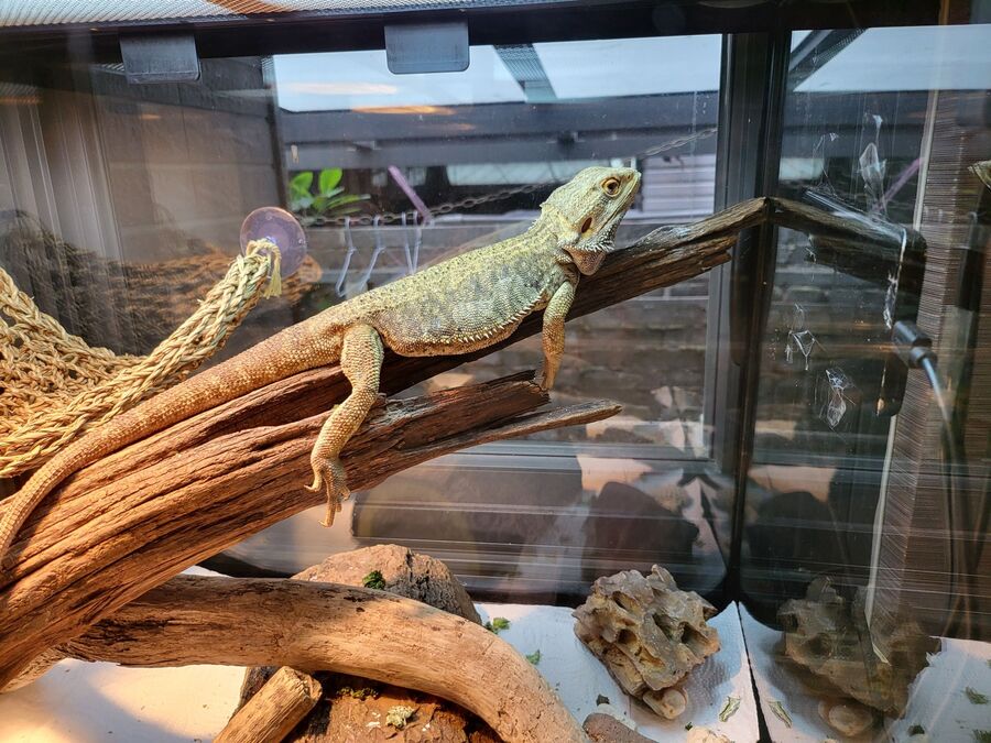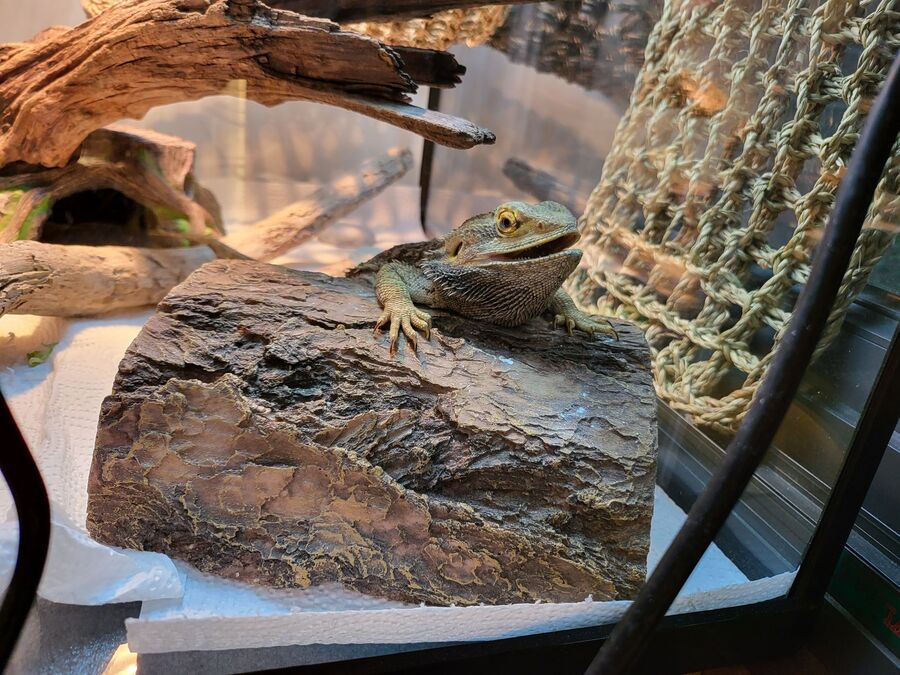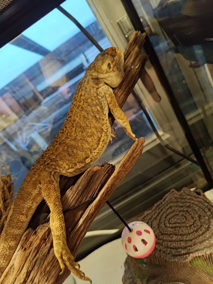 To the left of the desk is Richard in his house of glass. He is a fat and lazy bearded dragon that glares at me from his stick all day while I work. Here’s a video of him runnin’ around.
