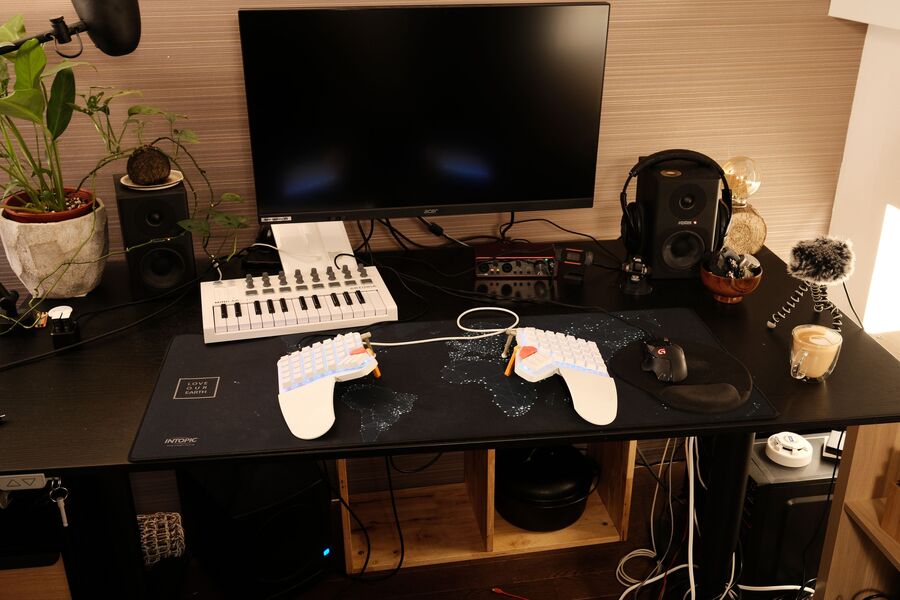 Focusrite Scarlett 2i2 plugged into two Fostex monitors + some enormous subwoofer. Arturia MiniLab mk2 for MIDI keyboard, Logitech G502 mouse, ZoomH1n for a mic because the one on my off-brand webcam broke (I also use this to make ambient sound videos and free audio recordings lol), an Ikea standing desk, some chair I bought from some company that went out of business in Taipei, random deskmat I found in Guanghua Digital Plaza.