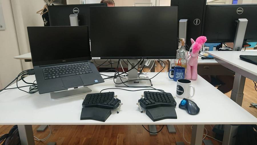 I was a MacBook user for a number of years when I started at Tradeshift, but now I'm back to my PC roots, using a Dell Precision 5520. Most of the time, I have it hooked up as a secondary screen, with a 25" Dell U2518D being the primary. As for peripherals, I've used my Logitech M570 Trackball instead of a mouse for almost a decade, and last fall, I took the plunge and bought the black ErgoDox EZ. This was originally just my work setup, but when I finally got the space for a proper home office nook, I ended up replicating my work setup at home as well.