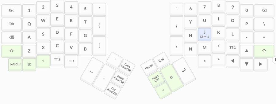 My layout is a little weird. I place only left brackets on layer 0, as my IDE can complete the right brackets in most cases.