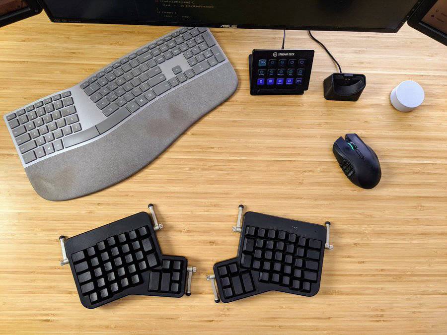 For my inputs, I use an ErgoDox EZ with Cherry MX Blue keyswitches. The keycaps are the plain blacks, but I'd like to get custom ones eventually. I've got a custom setup for the firmware that is highly specialized for my coding needs. I use a Razer Naga and put all 19 programmable buttons to use. I've got Bose 700 Noise Canceling headphones for when I need to disappear and focus.