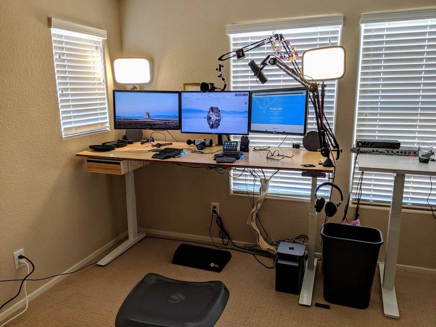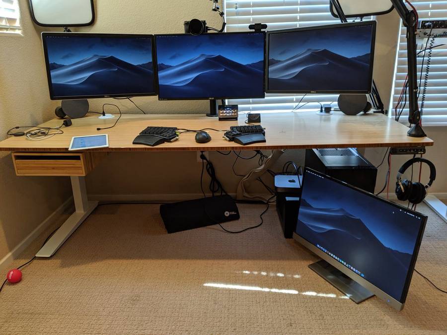For my main desk setup, I use a Mac Mini that powers three 4k screens. It's also got an external GPU with a Razer Core X and a Vega 56 Graphics Card. All of that sits on top of a Jarvis, a convertible standing desk by Fully.