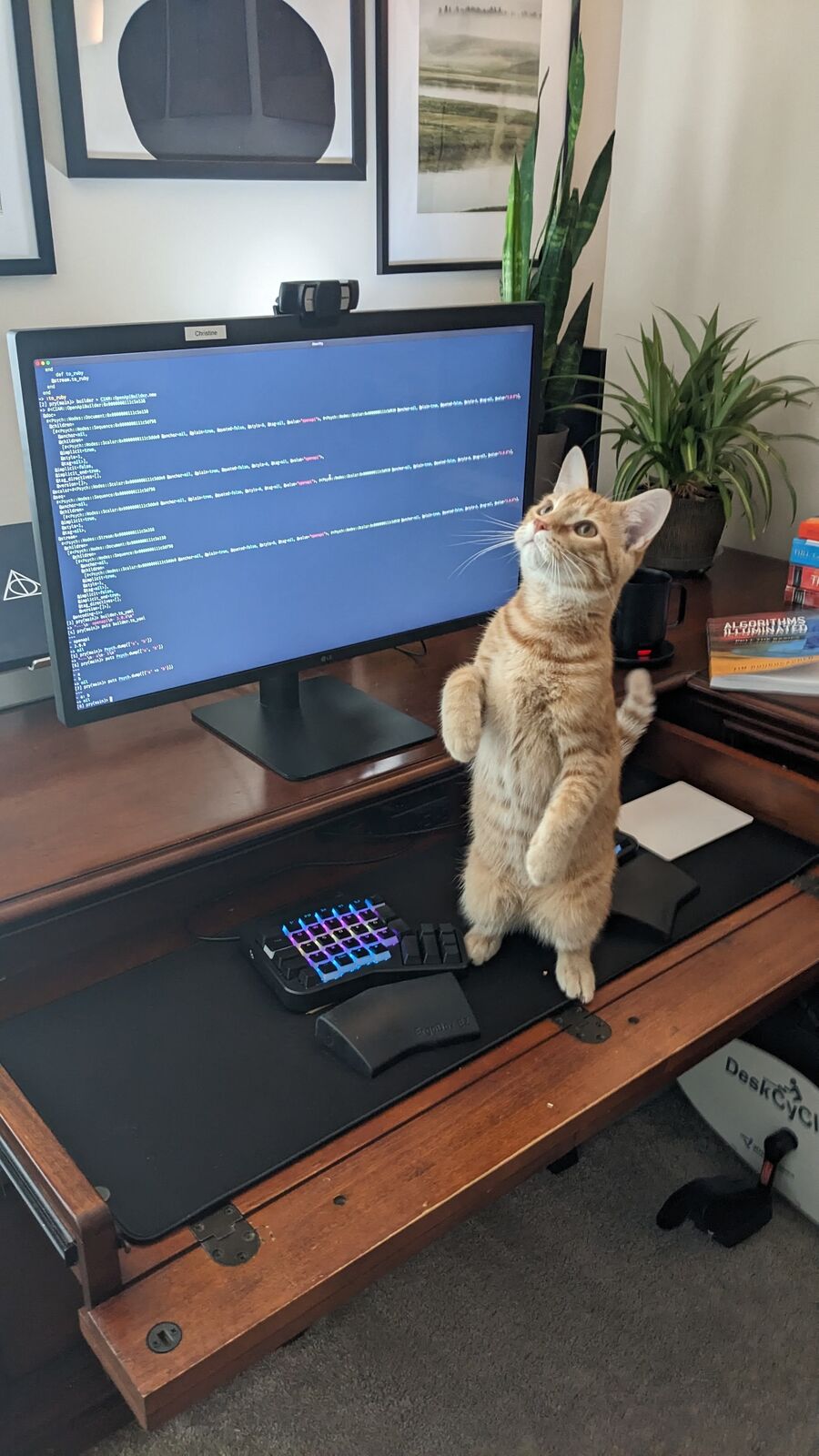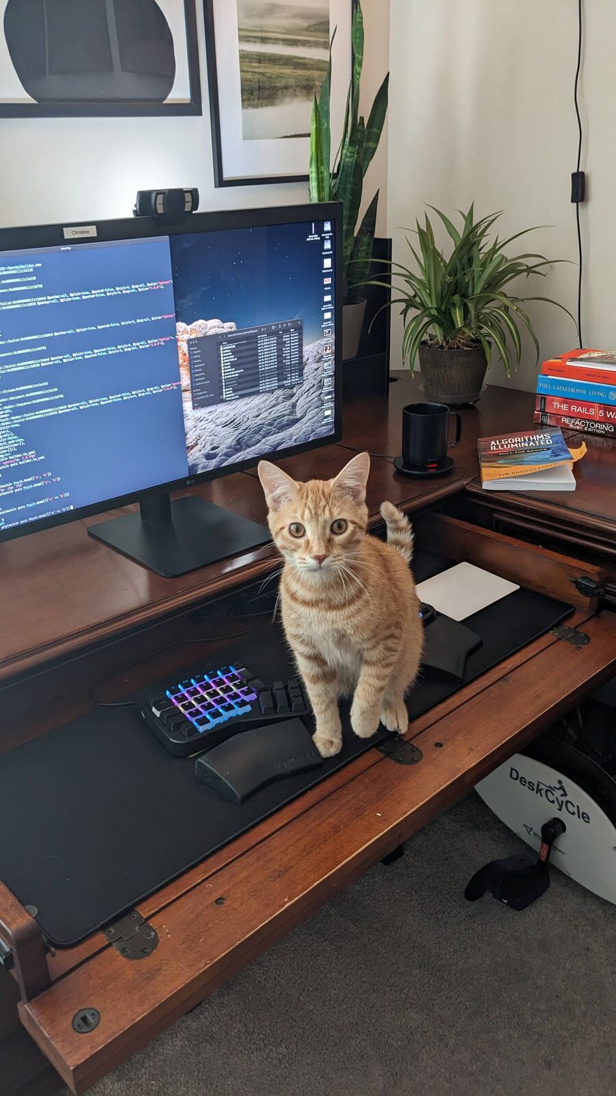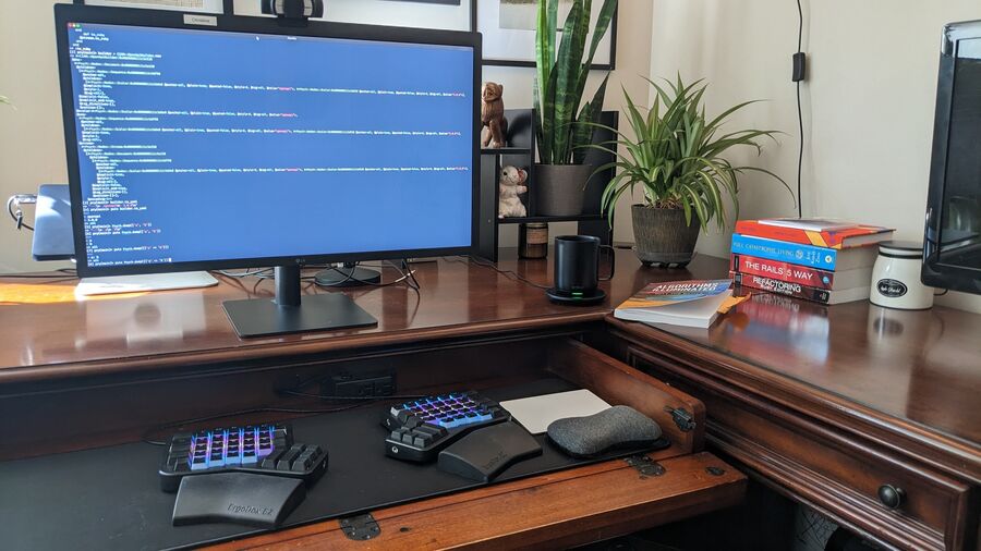 Professionally I use a MacBook Pro (16-inch, 2019) with an LG UltraFine 5k 27" monitor with a black ErgoDox EZ Glow keyboard. I am one of those odd technical people who prefers just one monitor. I understand needing more screen space, but it hurts my neck, thinking about staring off in those weird angles. Personally, I am even more boring and use a Mac mini M2 with an old HP monitor. I just need it for The Sims and my extensive ebook library. 😁
