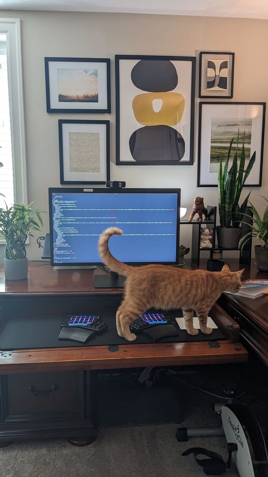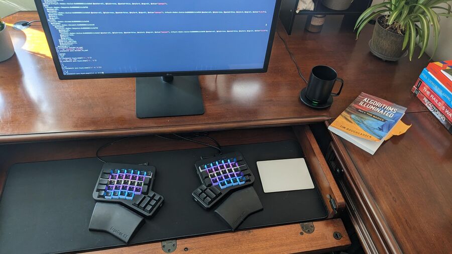 I would love to move to a sit-stand desk, and, frankly, have some southern exposure to bring more plants into my room. My current view out my window is my neighbors’ air conditioning and DirecTV antenna, so something more scenic to see would be amazing. Besides that, I have been working from home for a while now, and I have figured out many other ergonomics that you overlook until you use your home office full time. In future Ergodox EZs, I would love to see more glow keys, but the pudding keycaps help the light shine through with my current setup.