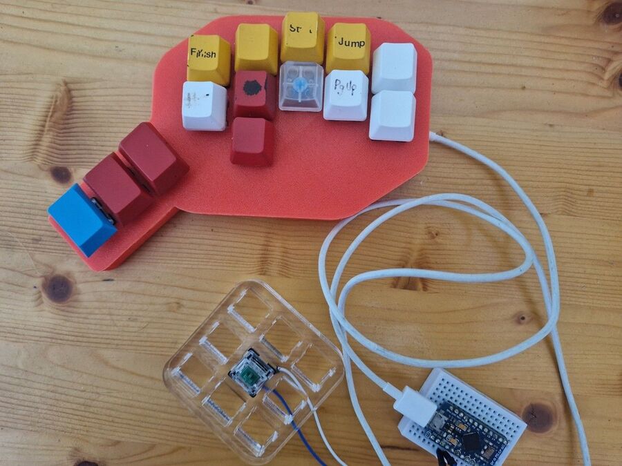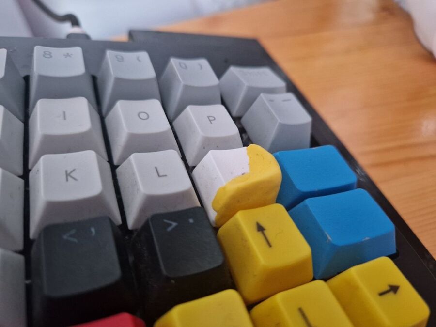 It’s like a Fifteen Puzzle game, shuffling the tiles around and getting nowhere as there isn’t enough space to sort things. In the end, I got myself a huge macropad and took everything off the ErgoDox. Then, when I needed something, I brought it back onto the ErgoDox. Starting a novel with “Once upon a time...” I realised I needed an “o”... and a Shift key, and an “n” and “c”, “e” and so on. That’s an exaggeration; I knew I needed the qwerty keys, of course, and the numbers, but with the others, it really was like that. Putting the Shift key under my thumb (aren’t thumb clusters great) freed two other keys, and moving Backslash meant I could get the cursor keys in the proper shape and so on and on. It’s always going to be a work in progress. For example, there’s a yellow key just here with an X on it that doesn’t do anything at all.