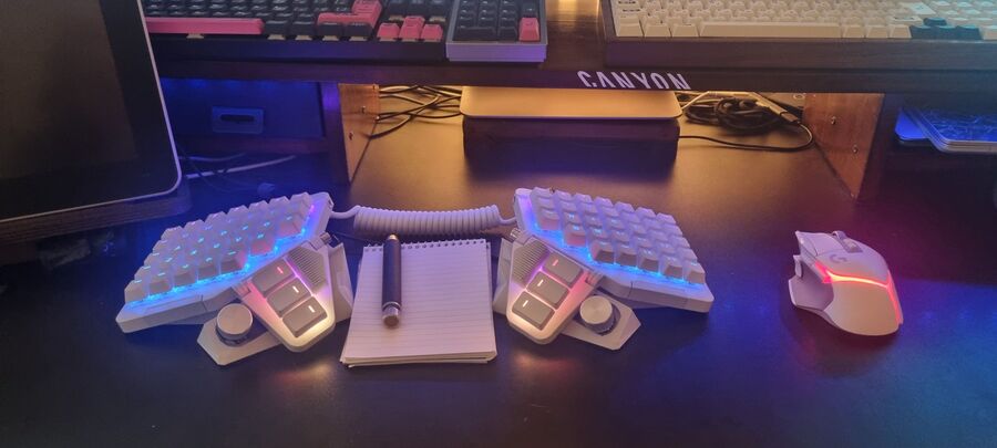 I have three mice—one is hooked up to work, sitting on a mouse jiggler. This way I can go brew a coffee in the kitchen and don’t need to log in again when I return to my desk. The second mouse is for safety, in case my Bluetooth Logitech runs out of juice. Mainly I use a Logitech G502 X Plus, where I can customise every function. Copy-and-Paste is on left+right on the mouse wheel—once you use it, you won’t go back. Beside that, I have a Keychron and a YMDK 96 percent keyboard, all with Glorious Pandas and modded. The Keychron I use mainly to play Dota 2. I logged around 4000 hours on Dota with the Keychron, and my brain refuses to use the Moonlander with the game, so I don’t force it.