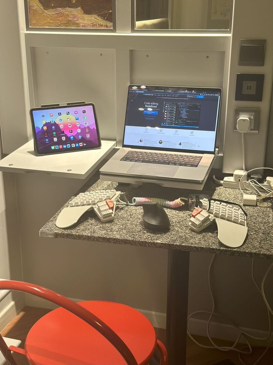 Easy, very easy. Apple Vision Pro, the ZSA Moonlander, and my trusty Logitech MX vertical mouse. The perfect setup if you ask me. Oh, you actually are asking me.