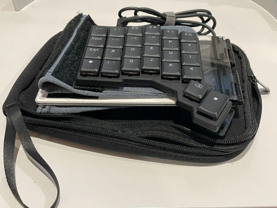 There were some challenges, though! For my coding (especially with Emacs mappings) I need the full array of modifier keys, which is difficult with the small size of the Voyager. I ended up using regular keys for Command, Ctrl, and Shift, with a long press by my right thumb for Option. I do miss having direct access to Tab, Esc, and brackets/braces, but that’s a fair tradeoff for portability. I’m not making much use of layer 1 beyond those, so I am sure that I’ll do more optimization of the layout over time. I’m using the ZSA keycaps (and kudos to ZSA for including Dvorak-appropriate home row bumps for the U and H keys), though I may get tempted by some of the cool keycaps out there.