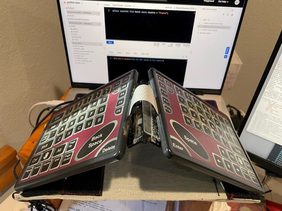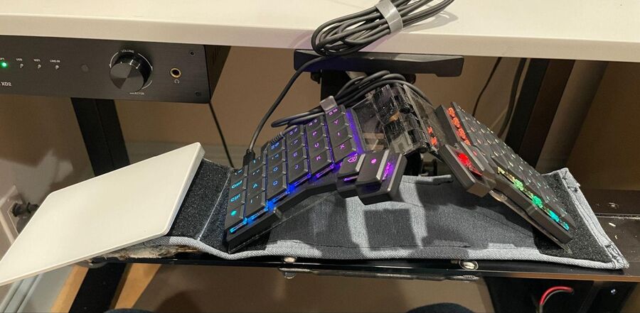 For the past few years I’ve been looking for a new mobile keyboard. When a coworker pointed out the ZSA Voyager, it looked like just what I needed: tiny, with real keyboard switches, programmable, and tentable. I created the tent using 1/16” acrylic sections with plastic hinges on top, and adhesive Velcro on the bottom. The tent has large rare earth magnets glued to it, which hold the Voyager sections in place. I put some grip tape on the bottom of the Voyager to provide just the right amount of friction: The sections are stable, but can be adjusted when needed. In total, barely $10 in materials. TAP Plastics is a great source for fabricating stuff like this.