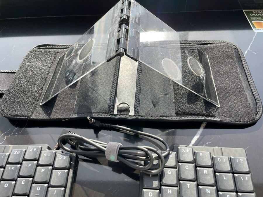 It is super light and portable, though. Twenty years (and many ribbon cable replacements) later, it is still working. Alas, the FingerWorks company is no more, having been bought by Apple in 2006 because Apple wanted multitouch technology patents for some reason. Note that the FingerWorks keyboard originally came with a metal tenting support for desktop use, I made it foldable and portable by creating a tent from two pieces of 1/16” acrylic with plastic hinges, adhesive Velcro, and denim from a worn-out pair of blue jeans.