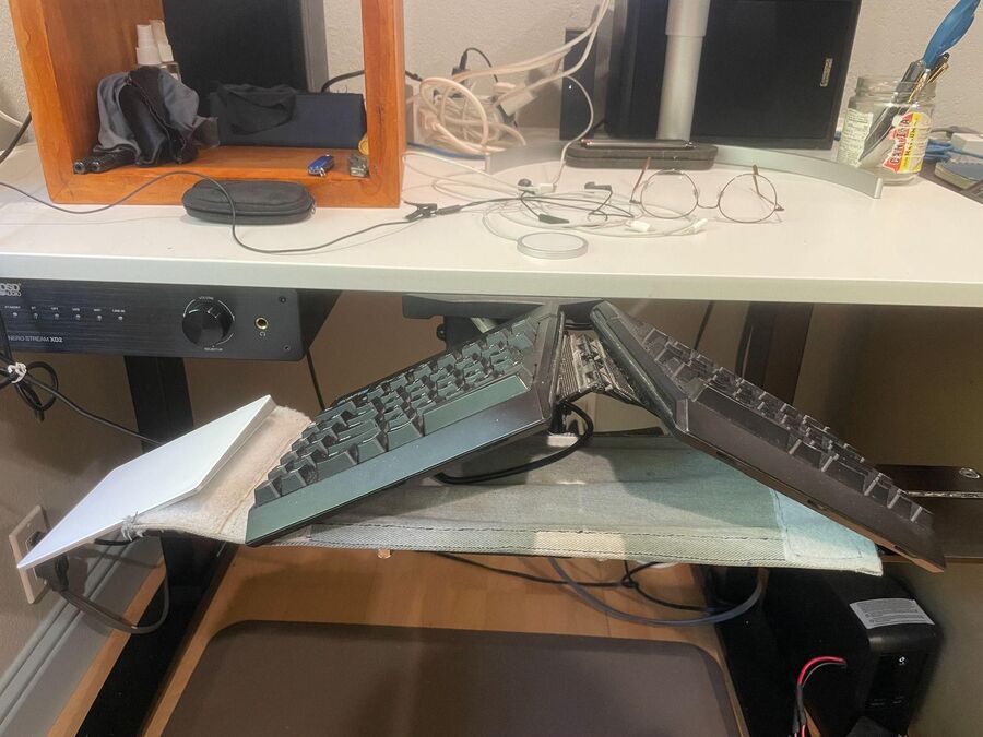The keyboard that really worked (for me) was a “Comfort Keyboard,” which had a very clever mechanical mechanism that allowed the two halves of the keyboard to be positioned at any angle from flat to 90 degrees. It seems that my wrists really don’t like typing unless the keyboard is tented between 30 and 45 degrees. The other great feature was that the keyboard was programmable (pretty good for the 90s), so I could make the left space bar the backspace key. I think that reaching for the backspace key with my right pinkie finger was definitely contributing to the tendonitis—I do use backspace a lot. I had several Comfort Keyboards over the years—they are nice but super heavy and not mobile at all. My last working Comfort is at my desk at work, still hanging on, but perhaps to be replaced by a Moonlander one of these days.