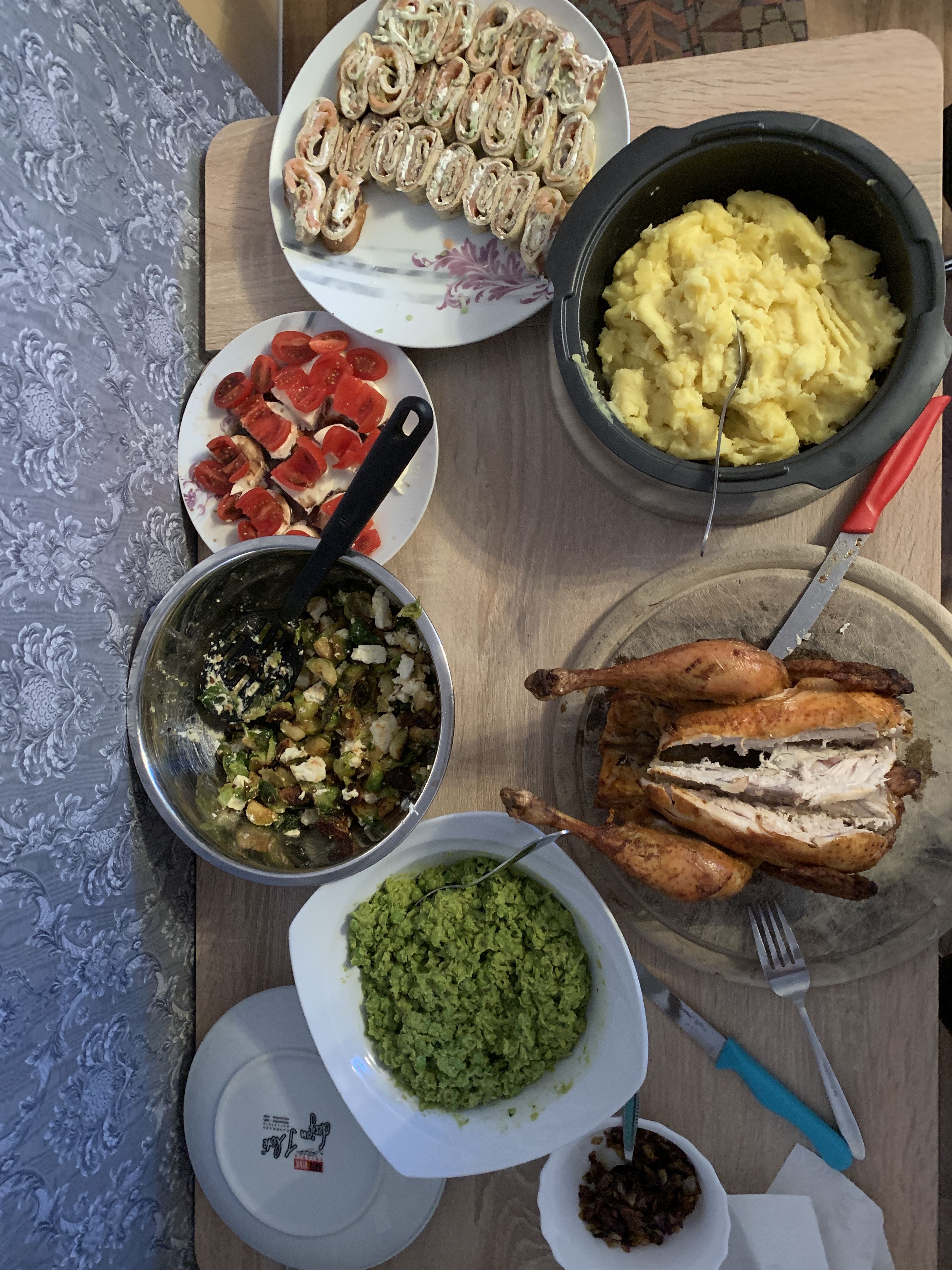 Roasted chicken, green pea mash, roasted Brüssels sprouts with Feta, potato mash with crunchy onions, smoked salmon rolls, tomato with mozzarella -- and there's some medium-rare steak hidden under a plate in the corner. You might say I like cooking nearly as much as keyboards. ;-)