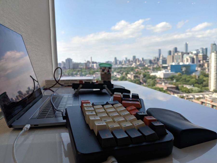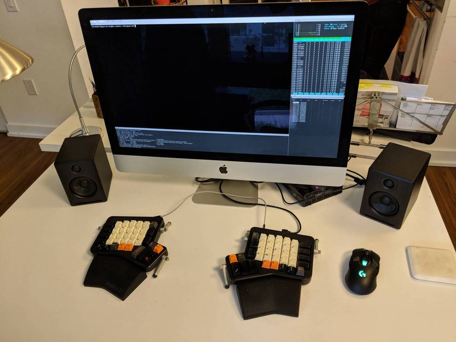 I’m quite proud of my custom layout. I make heavy use of dual-function keys, sacrificing a little bit of raw typing speed in favor of minimizing hand movement. All modifiers, arrow keys, and mouse control are available in the home row, so most keyboard shortcuts and small mouse adjustments can be made without moving my hands or looking away from the screen.