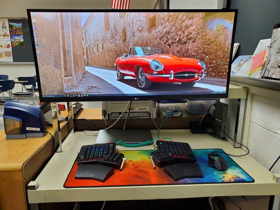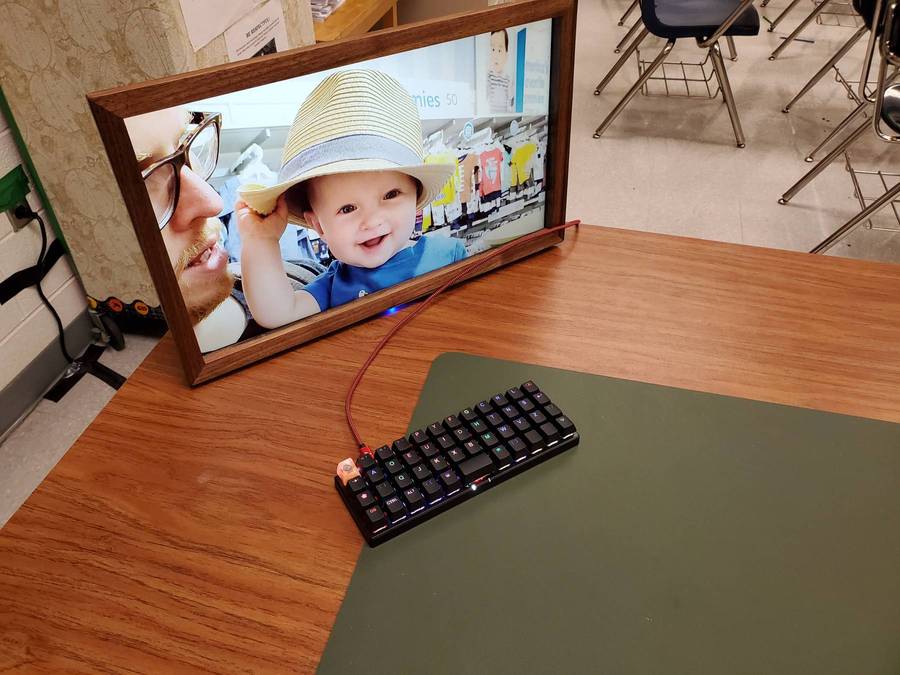My primary use of hardware is at work. I use a Dell XPS 13 which, for work purposes, boots Windows 10. This connects with one Thunderbolt cable to an LG 34BL850-W ultrawide 1440p HDR monitor, which provides power and USB 3.0 passthrough. Connected to the USB ports, I have two USB 3.0 hubs through which my mouse (Logitech G502 Hero), keyboard (ErgoDox EZ Glow in black), ethernet, VOIP phone, printer, classroom projector, SMART Board, wireless presenter, and portable SSD connect. This setup makes transitioning from home to work, or even place to place in the school, completely seamless. Also at work, I have a Raspberry Pi which I’ve built into a custom digital photo frame using a 17” 1080p monitor and a walnut bezel. I’ve programmed it with a custom script that loads and runs a randomized slideshow of family photos at boot. However, I often have my Planck EZ Glow connected and, with a couple simple terminal commands, it will boot to the Raspbian desktop where I can use it for any of a variety of purposes. Among other things, I use it occasionally for retro gaming, which can be a lot of fun.