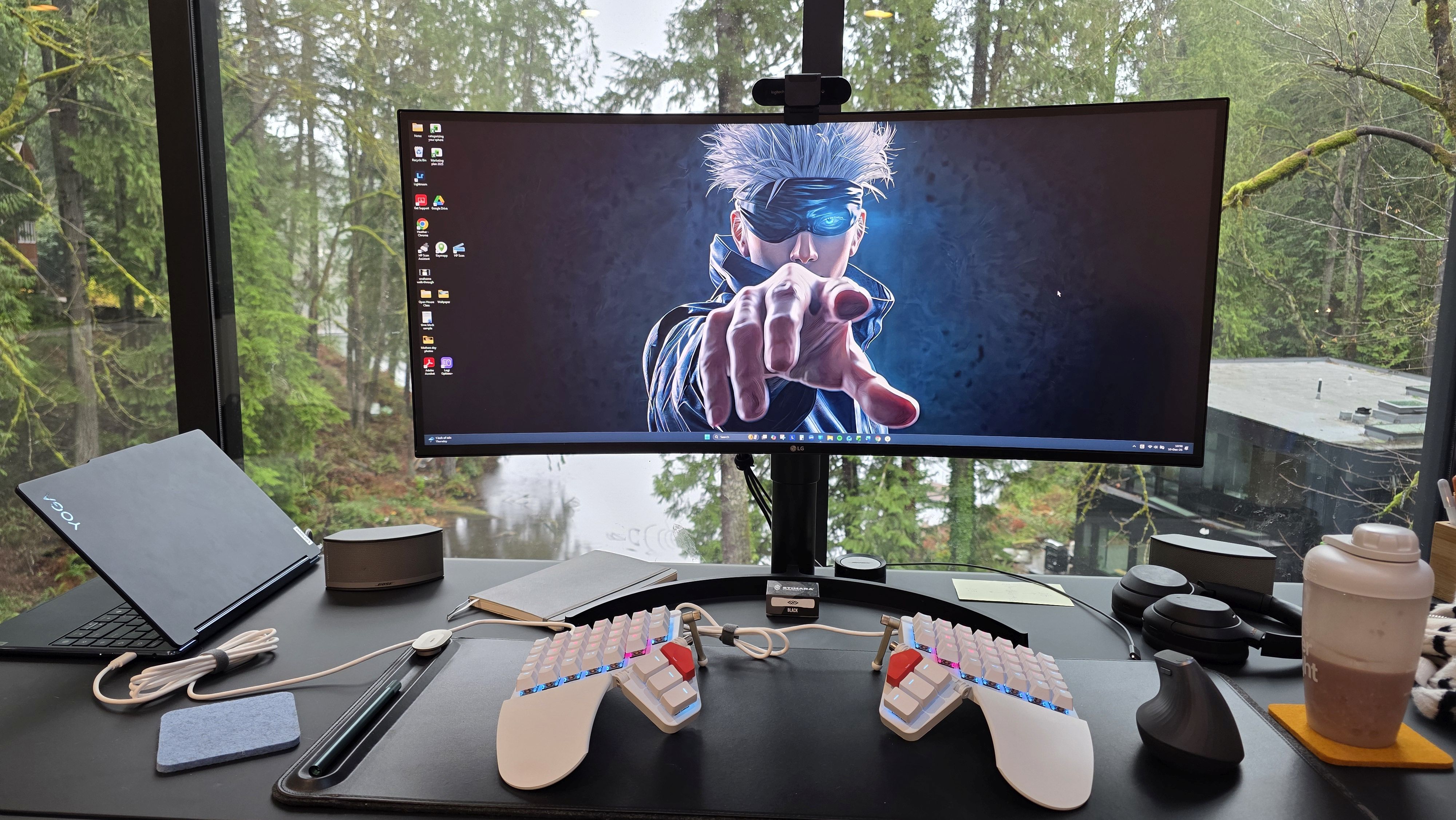 Since I wear approximately 1,259 hats as a real estate agent, I need equipment that can keep up. My core setup includes an LG UltraWide monitor (for all the multitasking), a Lenovo Yoga 9i (for bouncing between contract writing and marketing designs), Bose speakers (for jamming to heavy dubstep one minute and soft piano the next), and a Logitech Brio camera (for client calls and CE classes). A Dell dock makes it all talk nice around the campfire. I navigate with my Logitech vertical mouse (for my wrists, which protest traditional mice) and of course, my beloved Moonlander. Then there’s my Larq bottle (aka my emotional support hydration vessel) and my Stimagz (aka my ADHD’s emotional support fidget).