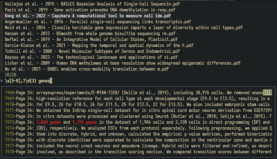 Together, ripgrep-all and fzf allow me to use regex to find specific patterns in PDFs (in the picture I’m searching for articles that mention a gene count between 5000 and 8000, with or without a comma in the number)—a functionality I haven’t yet seen in any reference manager.