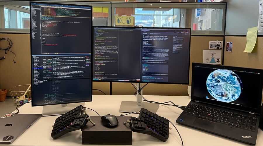My lab bought me a Lenovo ThinkPad P16 Gen2 with 64GB of RAM, which comes in handy since I work with large genomic datasets. They also provided me with two Dell 4K monitors. I keep my one monitor horizontal as my primary display and the other vertical for email, Slack, and my SSH session on our HPC. I also have a MacBook Pro from 2020 that I use when I don’t want to carry the rather heavy ThinkPad around.