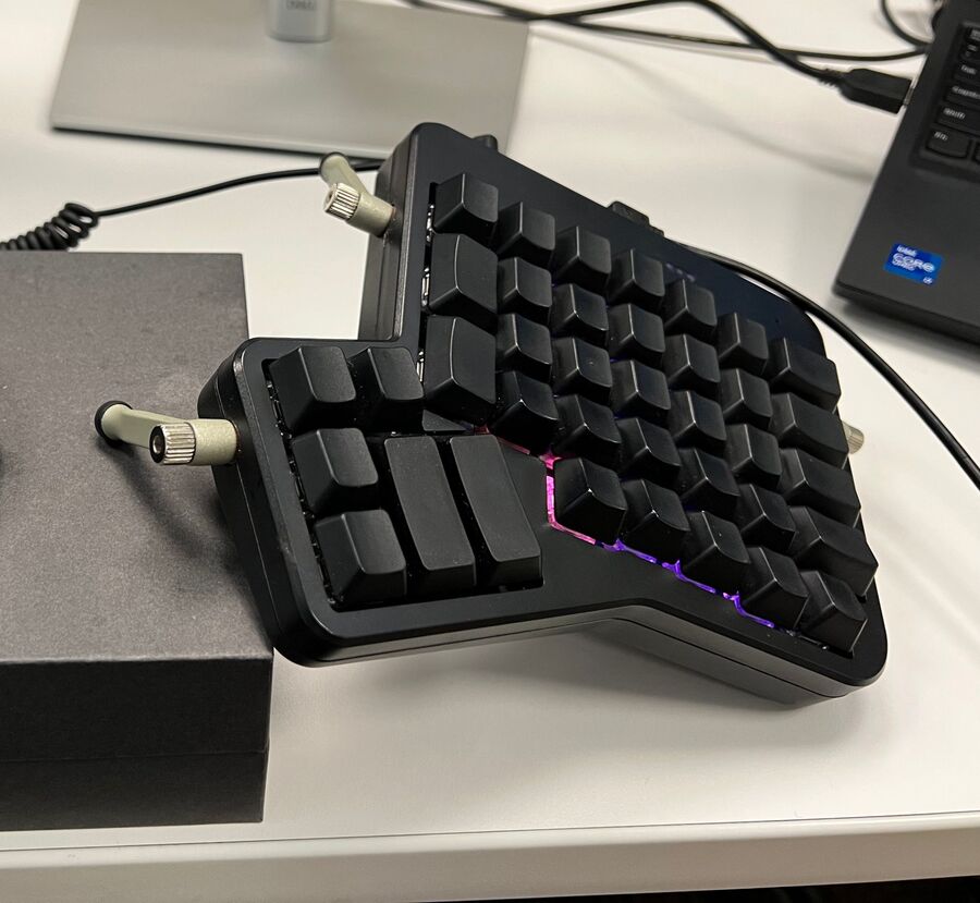 I use the ErgoDox EZ Glow with blank sculpted keycaps, which raises a lot of questions every time someone sees the split and the blank keycaps for the first time. I like a somewhat aggressive tent level, and my chair armrests extend forward, allowing me to float my hands over the keyboard at an angle that feels like a natural resting position.