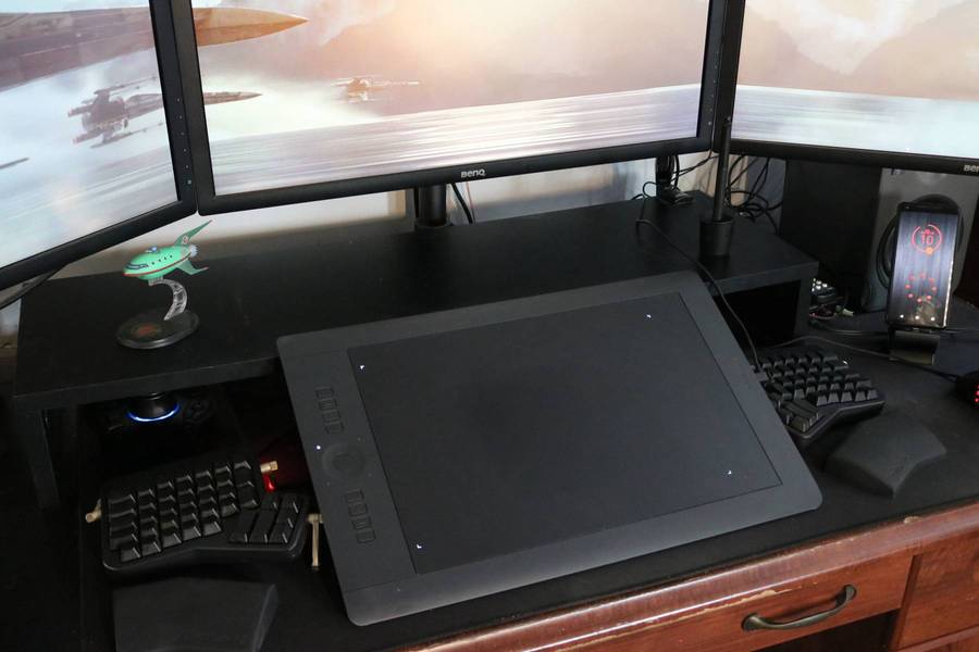 My keyboard setup is a black ErgoDox EZ with the standard blank DCS keycaps. I have tried various custom keycaps but I keep going back to the DCS. My layout is one fairly standard layer with a few custosmizations, and a layer with a left-handed numpad and some custom CAD-specific shortcuts. Another layer is for media control. Both my custom layers are left-hand only, as my whole setup is geared towards as little taking my hand off the mouse as possible, without losing the efficiency of keyboard input. To help with this further, my mouse is a fully programmable MMO mouse, with software-specific shortcuts and basic Windows functions mapped to the three-layer, 12-key thumbpad. I swear I did not set out to create a setup unusable by anyone but me, but this is just what evolved over the years. I have two configurations for my setup. One with my keyboard in a more traditional position, with my Spacemouse and normal mouse, and my sketching configuration, a large Wacom tablet in the center of my desk space and the keyboard halves on either side. I really like this setup, as I can stop during sketching to answer an email or Slack message without having to move anything around.