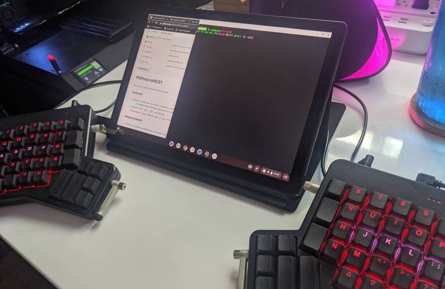Most of what I do is portable and I hate carrying things, so the devices that I use the most are probably my Pixel 4 XL or my Pixel Slate i7. Both are incredibly powerful little devices that—with the addition of a simple USB-C adapter—connect to one of my ErgoDox EZ Glow keyboards. The complete package fits in a pretty small shoulder bag, so I can travel light.