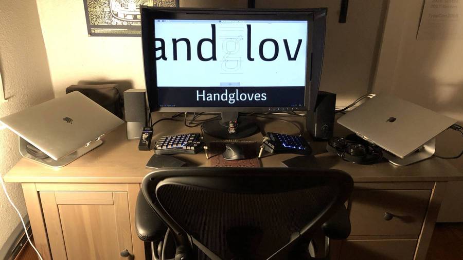 My black ErgoDox EZ Glow is supported by a Logitech MX Master with a very weary gesture button (Pro-tip for Adobe users: Macroing arrow keys to mouse gestures will save your right hand many trips).