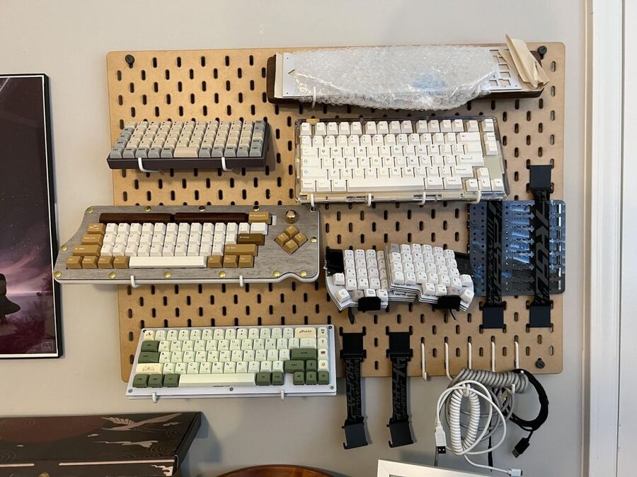 Although the two keyboards I mentioned earlier are my current favorite pair for daily use, I do switch out often with others in my collection. This includes the IDOBAO ID80 Crystal keyboard kit sporting the EPBT X BIIP Cool Kids keycaps set. Under the caps are Penguin tactile switches, which were painstakingly lubed but definitely worth the effort for how great they feel. The double-spacebar Spacey, designed by Vanilla, is one of the more unique builds I got from the P3D Store. Another build from OLKB, the Preonic Rev3, is fantastic when I’m needing the numrow and also the heaviest switches I’ve ever used, Kailh BOX Navy. The Matcha green board belongs to my wife, along with the “in-progress” Spacey up top. The additional split keyboard is the Lily58 Pro from KeyHive, which I am currently repairing for a friend.