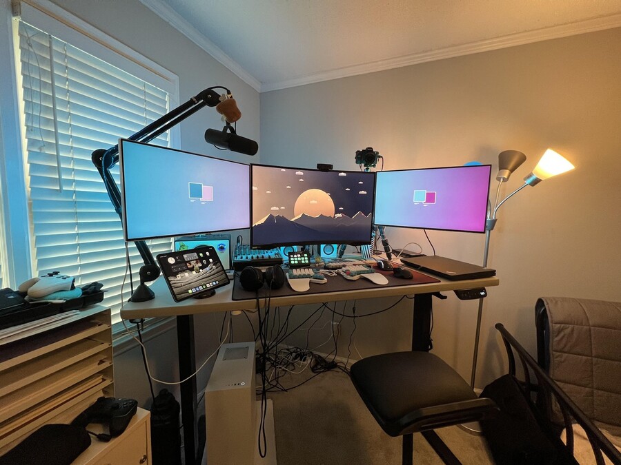 The Elgato Stream Deck has also made its way onto my desk and is a welcome addition. With easy-to-customize buttons and functions it has proven its use beyond just streaming. The camera I use for streaming and content is my trusty Sony Alpha a7S II with the Sony FE 2/28mm lens for that top-notch picture quality. For the mic, I’ve got a Shure SM7B on the RØDE PSA1 boom arm. The lighting setup I’m working with is four Philips Hue White and Color Ambiance Bulbs that I control through the previously mentioned Stream Deck. Along the back of the monitors is also a basic LED light strip with controls I mounted underneath the desk.