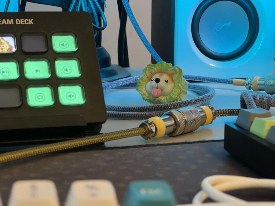 Finally we arrive at the keyboard and mouse. Currently in use is the Glorious Gaming Mouse Model D that I am test-driving to see if I’d upgrade from my secondary mouse, the Logitech G502 Lightspeed (currently my work mouse). As for keyboards, I’m using the phenomenal Moonlander Mark I with a set of Drop MT3 Camillo keycaps for the main keys and alts from Drop MT3 Dasher keycaps. The switches are Gateron Black Ink V2s, which are a subset of my favorite type of switch, the Cherry MX Blacks. My secondary keyboard for work is the OLKB Planck Mechanical Keyboard V6, which is the first kit I ever built back in 2018. To connect everything, I’m using custom detachable USB cables. This makes it really easy to swap between different keyboards for different machines. The cables are all from a good friend of mine who runs an online custom cable store called Onyx Cables.