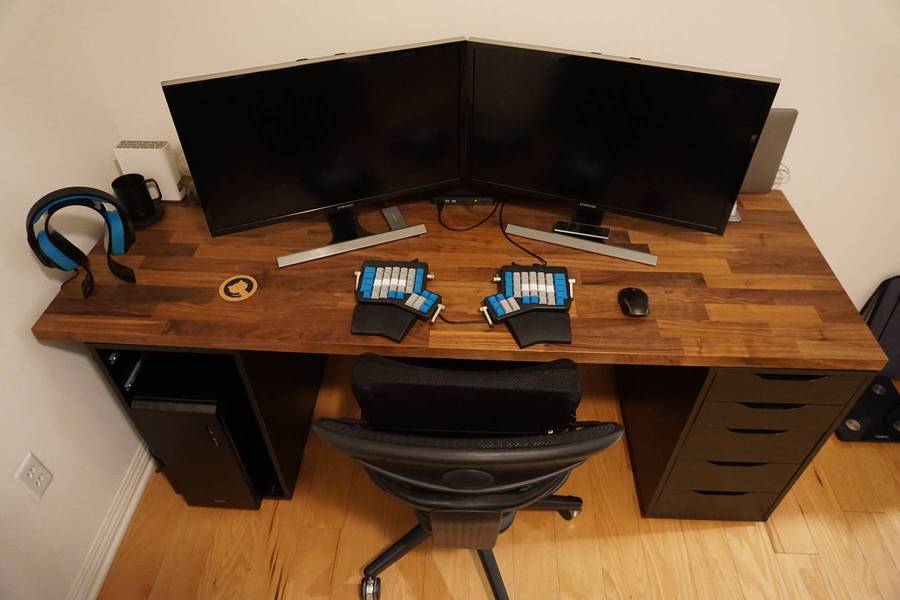 My setup doesn't stop there. For productivity and speed, I use the ErgoDox EZ Keyboard with Cherry MX Brown switches. (Never leave home without them!) The Logitech MX Anywhere 2 wireless Bluetooth mouse keeps me moving around the desktops when hotkeys just don't cut it. This setup is also mirrored at my work. I believe that it's important to keep the transition as seamless as possible.