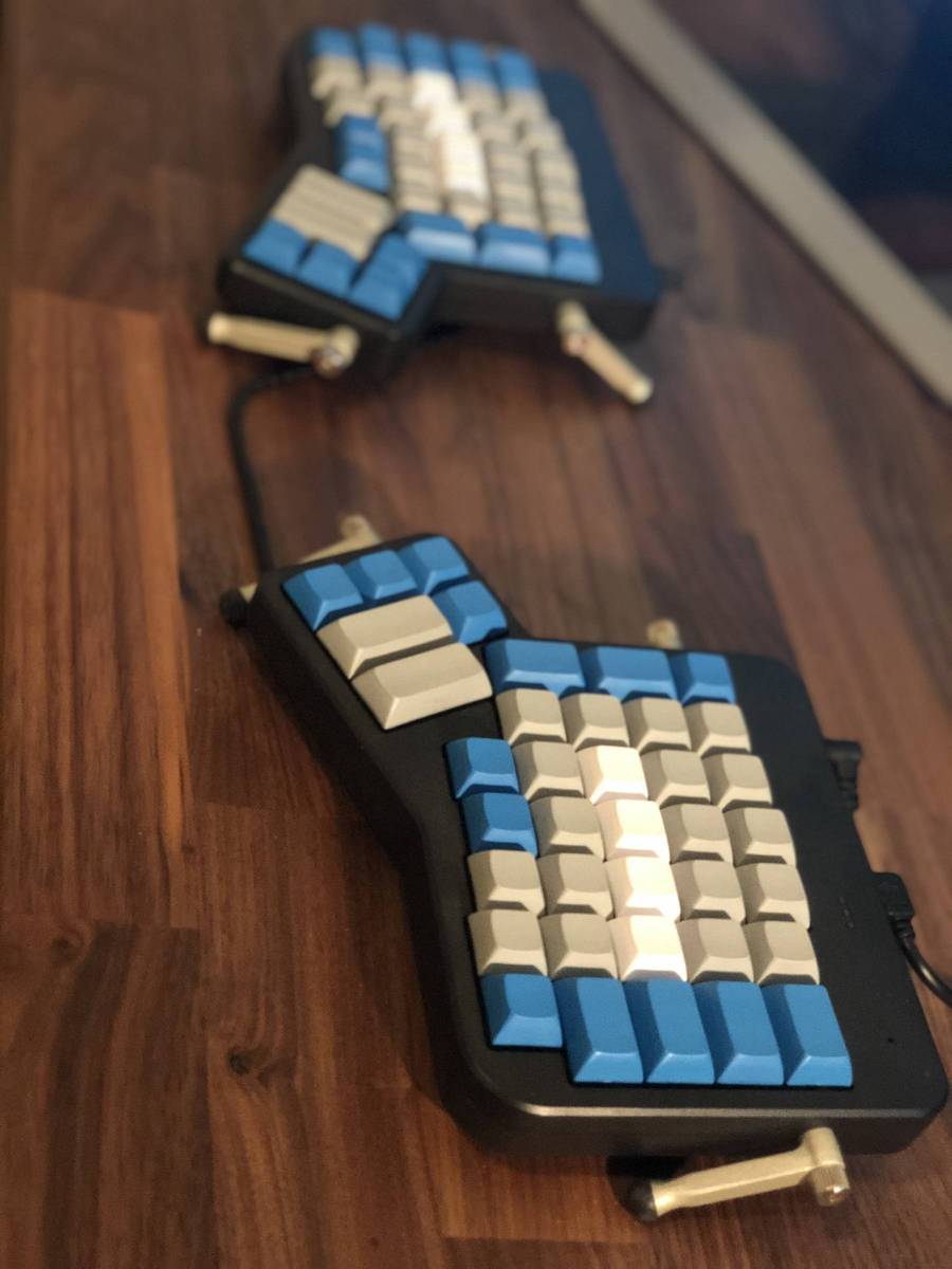 I haven't gotten into using any custom layouts yet. So far, I have felt pretty satisfied with the default. However, I have already added custom non-printed keycaps from PimpMyKeyboard. I have chosen three different colors: a light blue for the outer keys, light grey for the inner keys, and white for the home row keys to add a little extra style. Having a non-printed keyboard gives me the flexibility for any further customization I have in the future.