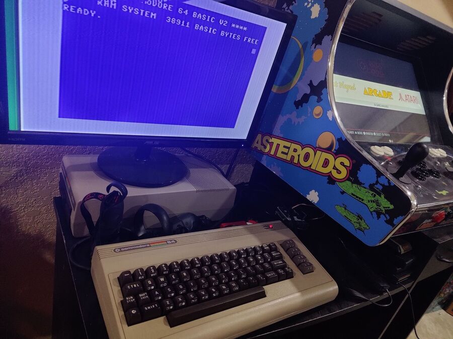 The hardware here is limited to a laptop for potential streaming, but mostly includes tools for creating models, painting, or various soldering benches for doing electronics work like console modding, the first of which was done on my first computer sitting right beside it. Bless this little C64 for lasting with me this long.